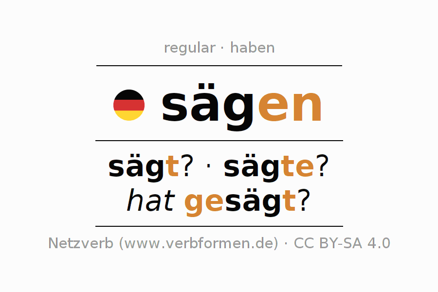 Tablas de verbos para la conjugación de sägen en línea, representadas de forma simple, con todas las construcciones verbales en singular y plural, en todas las personas gramaticales (1ª persona, 2ª persona, 3ª persona). El practicar la conjugación del verbo sägen es útil para tareas, exámenes, la escuela, la universidad, las clases de alemán y para los estudiantes adultos. Especialmente para los estudiantes del alemán es muy importante el conjugar los verbos y el formar las raíces verbales de forma correcta. Aquí encuentras más información acerca del tema Wiktionary sägen und unter sägen im Duden.