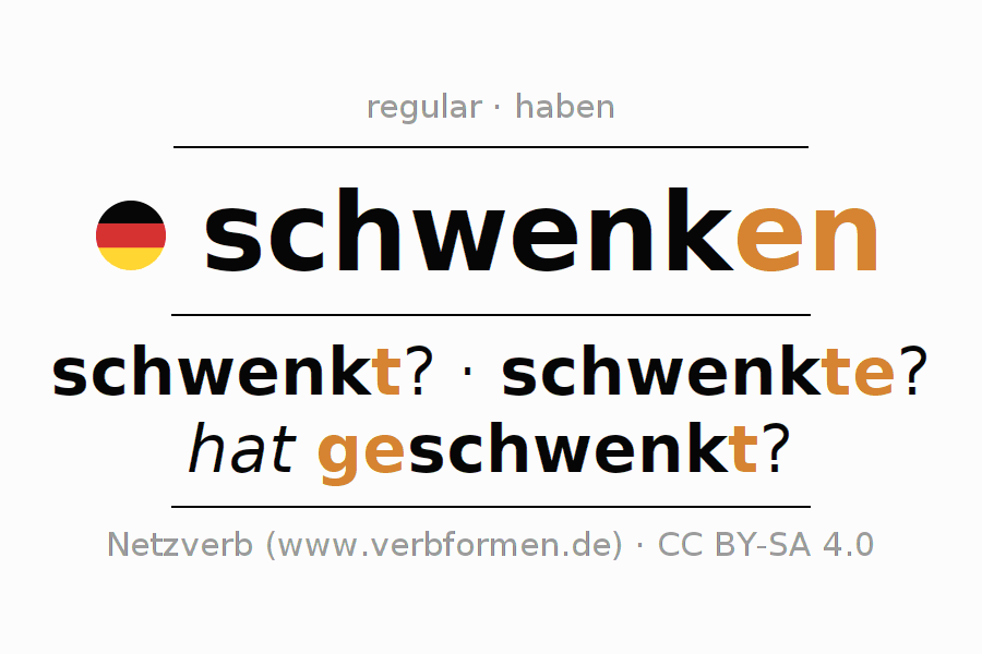 Tablas de verbos para la conjugación de schwenken en línea, representadas de forma simple, con todas las construcciones verbales en singular y plural, en todas las personas gramaticales (1ª persona, 2ª persona, 3ª persona). El practicar la conjugación del verbo schwenken es útil para tareas, exámenes, la escuela, la universidad, las clases de alemán y para los estudiantes adultos. Especialmente para los estudiantes del alemán es muy importante el conjugar los verbos y el formar las raíces verbales de forma correcta. Aquí encuentras más información acerca del tema Wiktionary schwenken und unter schwenken im Duden.