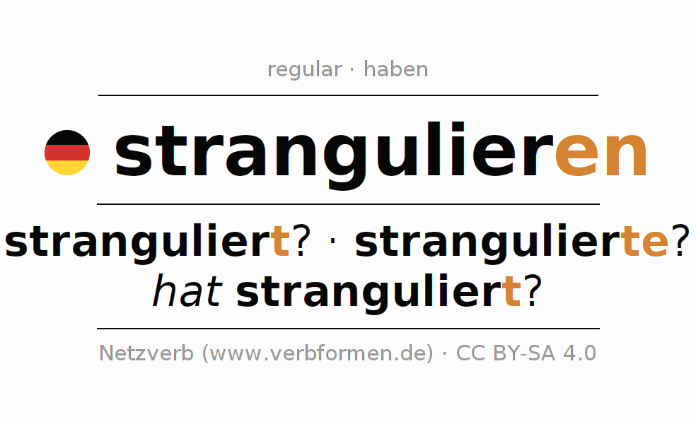 - Pasado perfecto: habe ich stranguliert?, hast du stranguliert?, hat er stranguliert?, haben wir stranguliert?, habt ihr stranguliert?, haben sie stranguliert?