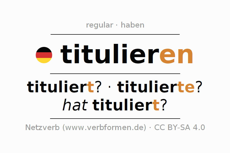 - Pretérito: titulierte ich?, tituliertest du?, titulierte er?, titulierten wir?, tituliertet ihr?, titulierten sie?