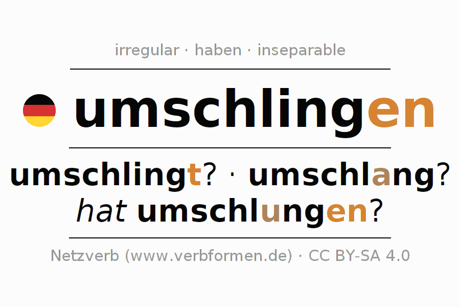 - Pretérito: umschlang ich?, umschlangst du?, umschlang er?, umschlangen wir?, umschlangt ihr?, umschlangen sie?
