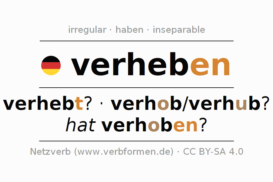 - Presente: verhebe ich?, verhebest du?, verhebe er?, verheben wir?, verhebet ihr?, verheben sie?