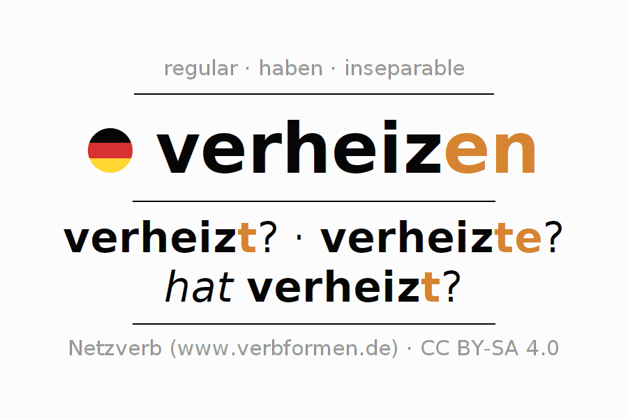 - Presente: verheize ich?, verheizest du?, verheize er?, verheizen wir?, verheizet ihr?, verheizen sie?