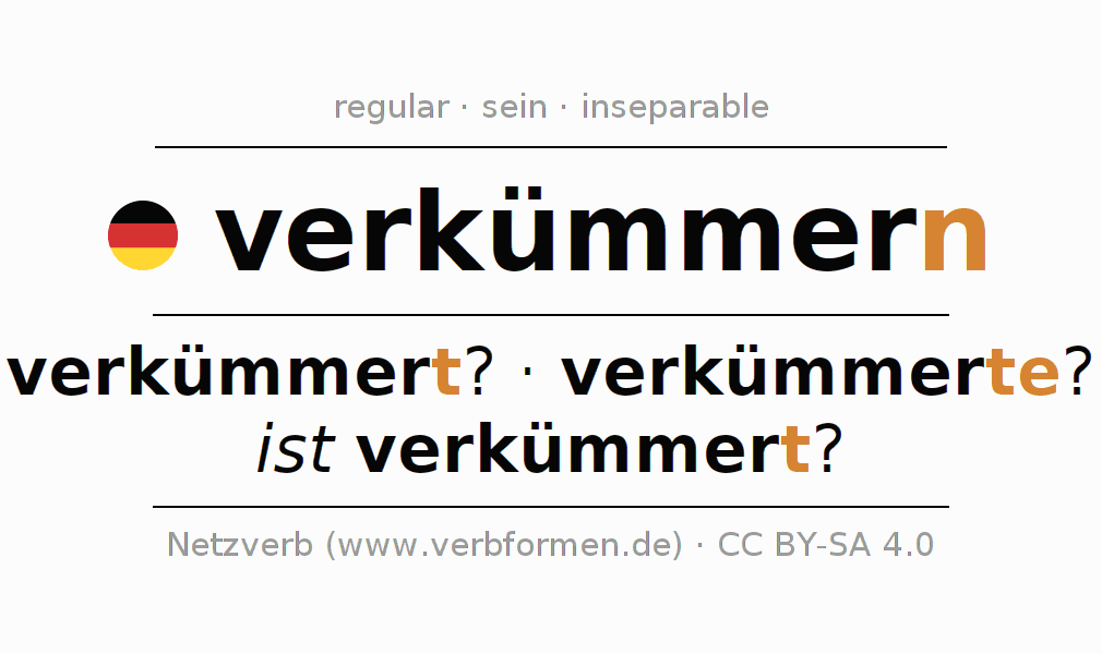 - Pretérito: verkümmerte ich?, verkümmertest du?, verkümmerte er?, verkümmerten wir?, verkümmertet ihr?, verkümmerten sie?