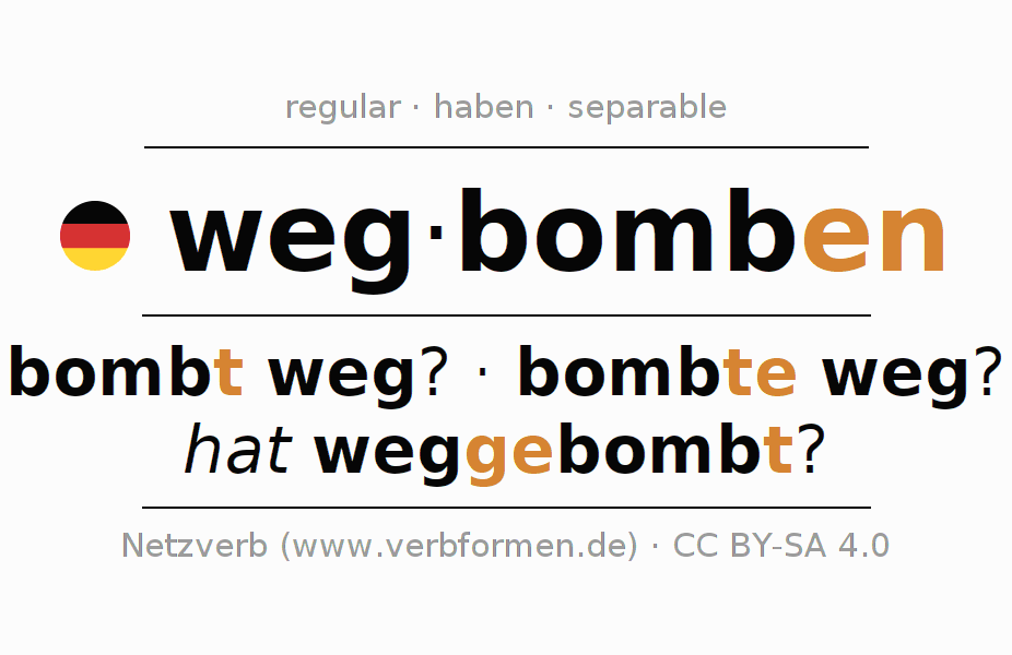 - Presente: bomb(e) (du) weg, bomben wir weg, bombt (ihr) weg, bomben Sie weg