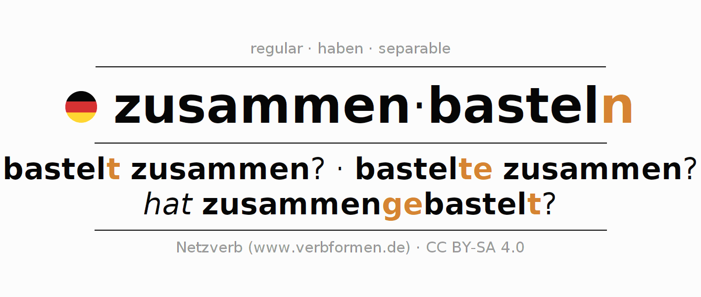 - Pasado perfecto: habe ich zusammengebastelt?, hast du zusammengebastelt?, hat er zusammengebastelt?, haben wir zusammengebastelt?, habt ihr zusammengebastelt?, haben sie zusammengebastelt?