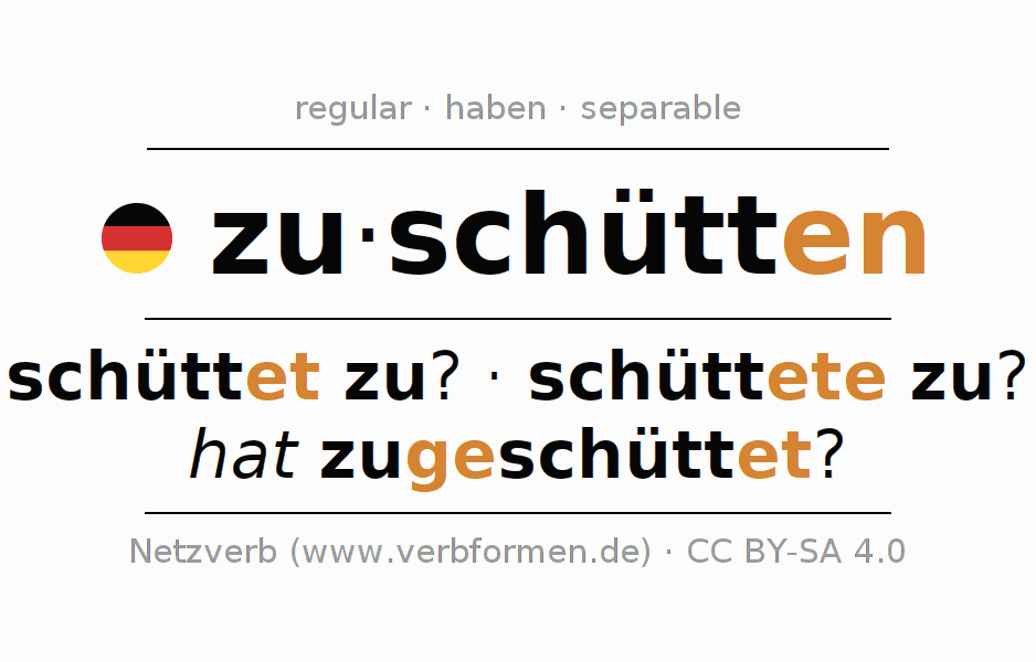 - Pasado perfecto: habe ich zugeschüttet?, hast du zugeschüttet?, hat er zugeschüttet?, haben wir zugeschüttet?, habt ihr zugeschüttet?, haben sie zugeschüttet?