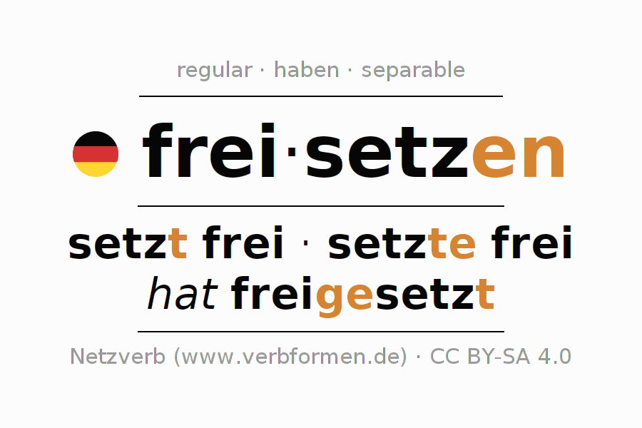Tablas de verbos para la conjugación de frei·setzen en línea, representadas de forma simple, con todas las construcciones verbales en singular y plural, en todas las personas gramaticales (1ª persona, 2ª persona, 3ª persona). El practicar la conjugación del verbo frei·setzen es útil para tareas, exámenes, la escuela, la universidad, las clases de alemán y para los estudiantes adultos. Especialmente para los estudiantes del alemán es muy importante el conjugar los verbos y el formar las raíces verbales de forma correcta. Aquí encuentras más información acerca del tema Wiktionary freisetzen und unter freisetzen im Duden.
