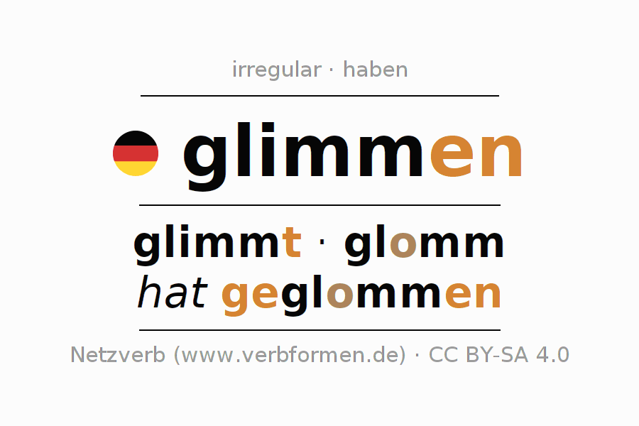 - Presente: glimm(e) (du), glimmen wir, glimmt (ihr), glimmen Sie