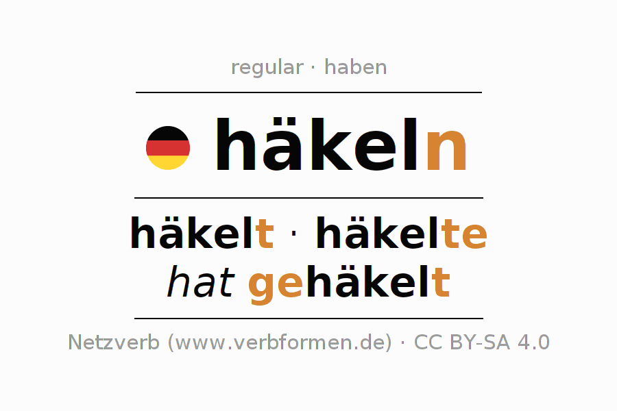 Tablas de verbos para la conjugación de häkeln en línea, representadas de forma simple, con todas las construcciones verbales en singular y plural, en todas las personas gramaticales (1ª persona, 2ª persona, 3ª persona). El practicar la conjugación del verbo häkeln es útil para tareas, exámenes, la escuela, la universidad, las clases de alemán y para los estudiantes adultos. Especialmente para los estudiantes del alemán es muy importante el conjugar los verbos y el formar las raíces verbales de forma correcta. Aquí encuentras más información acerca del tema Wiktionary häkeln und unter häkeln im Duden.