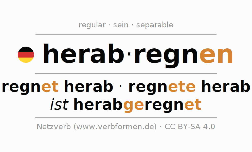 - Pasado perfecto: ich bin herabgeregnet, du bist herabgeregnet, er ist herabgeregnet, wir sind herabgeregnet, ihr seid herabgeregnet, sie sind herabgeregnet