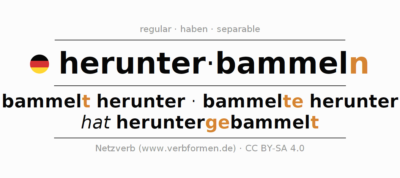 - Pasado perfecto: ich habe heruntergebammelt, du hast heruntergebammelt, er hat heruntergebammelt, wir haben heruntergebammelt, ihr habt heruntergebammelt, sie haben heruntergebammelt