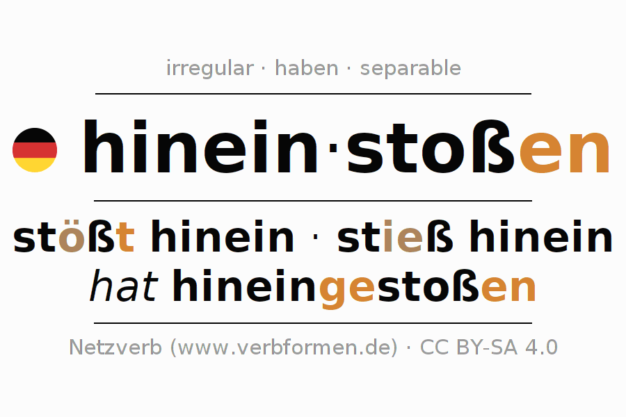 - Pasado perfecto: ich habe hineingestoßen, du hast hineingestoßen, er hat hineingestoßen, wir haben hineingestoßen, ihr habt hineingestoßen, sie haben hineingestoßen