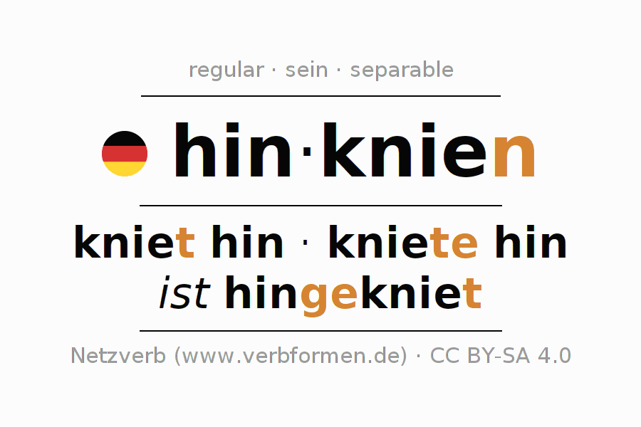 - Presente: ich knie hin, du kniest hin, er kniet hin, wir knien hin, ihr kniet hin, sie knien hin