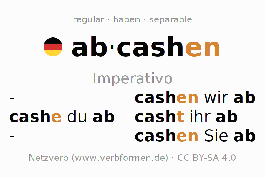 Este verbo abcashen (apoderarse, usurpar) se conjuga en imperativo de la siguiente manera: cashe (du) ab, cashen wir ab, casht (ihr) ab, cashen Sie ab