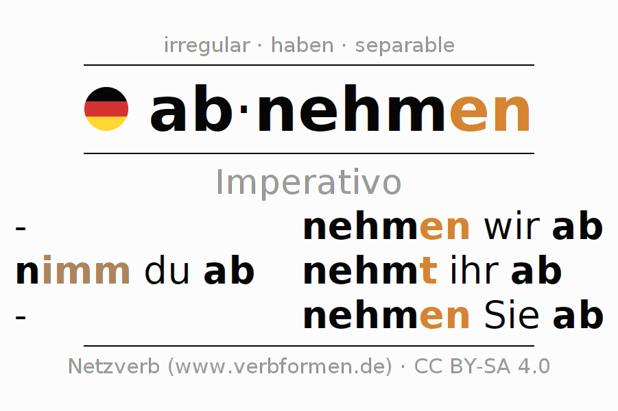 Este verbo abnehmen (perder peso, tomar) se conjuga en imperativo de la siguiente manera: nimm (du) ab, nehmen wir ab, nehmt (ihr) ab, nehmen Sie ab