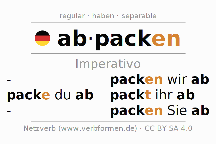 Este verbo abpacken (embalar, empaquetar) se conjuga en imperativo de la siguiente manera: packe (du) ab, packen wir ab, packt (ihr) ab, packen Sie ab