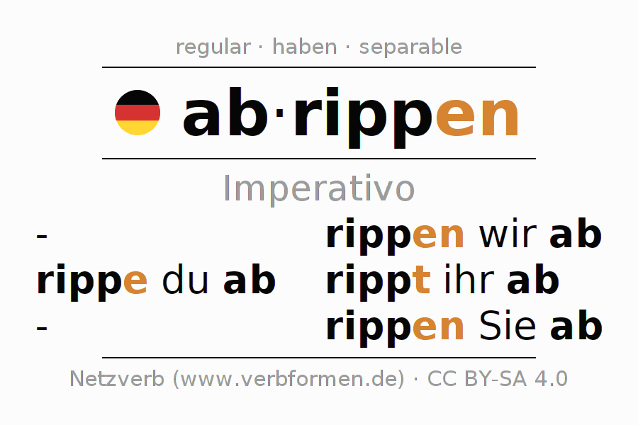 Este verbo abrippen (estafar, robar) se conjuga en imperativo de la siguiente manera: rippe (du) ab, rippen wir ab, rippt (ihr) ab, rippen Sie ab