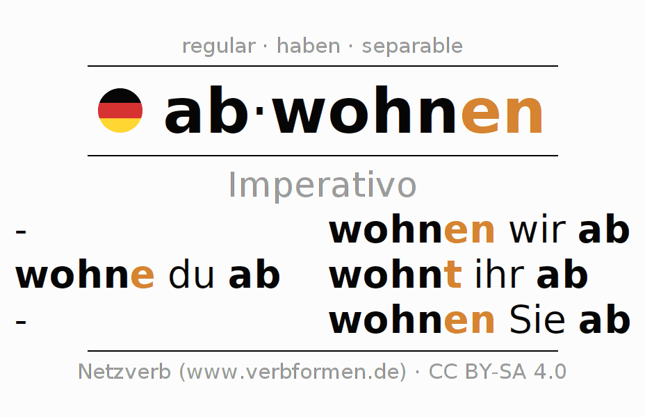 El verbo abwohnen, conjugado completamente en todas las personas y números gramaticales en Imperativo Presente.