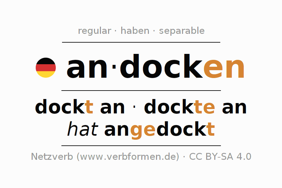 Este verbo andocken (acoplar, acoplarse) se conjuga en imperativo de la siguiente manera: docke (du) an, docken wir an, dockt (ihr) an, docken Sie an