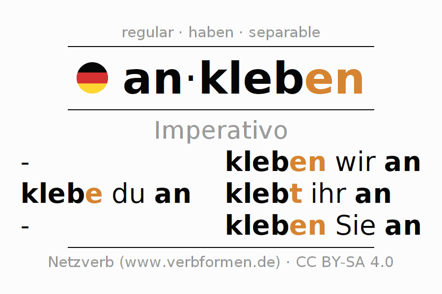 Este verbo ankleben (adhesivar, pegar) se conjuga en imperativo de la siguiente manera: klebe (du) an, kleben wir an, klebt (ihr) an, kleben Sie an