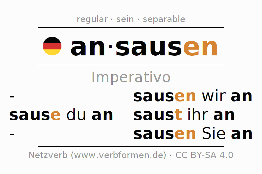 Este verbo ansausen (acercarse rápidamente, aproximarse) se conjuga en imperativo de la siguiente manera: sause (du) an, sausen wir an, saust (ihr) an, sausen Sie an