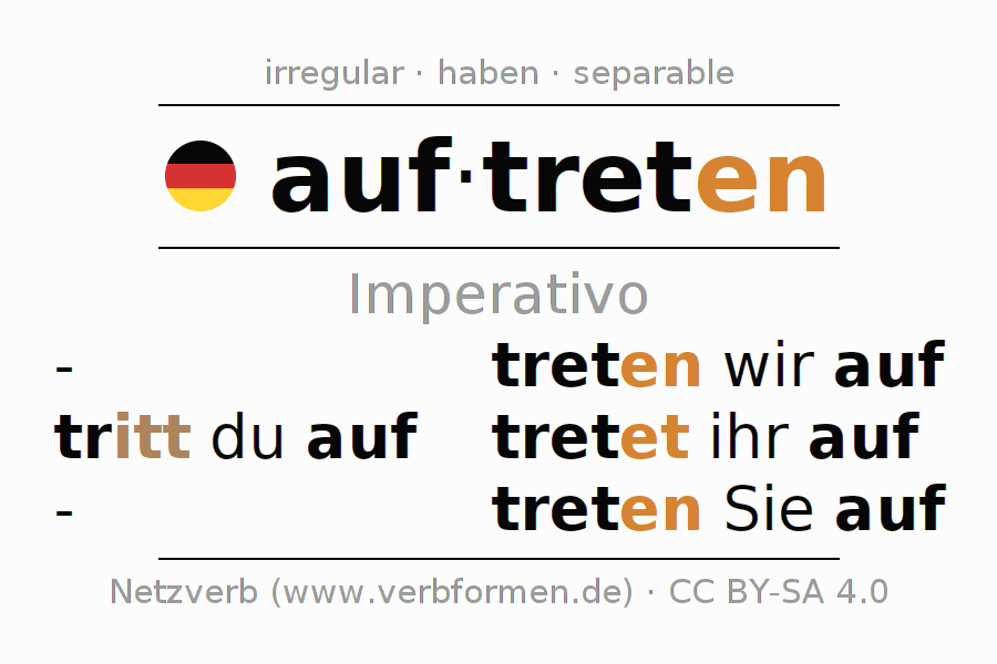 Este verbo auftreten (abrir, abrir a patadas) se conjuga en imperativo de la siguiente manera: tritt (du) auf, treten wir auf, tretet (ihr) auf, treten Sie auf