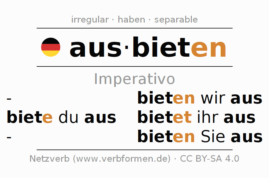Este verbo ausbieten (ofrecer, proponer) se conjuga en imperativo de la siguiente manera: biete (du) aus, bieten wir aus, bietet (ihr) aus, bieten Sie aus