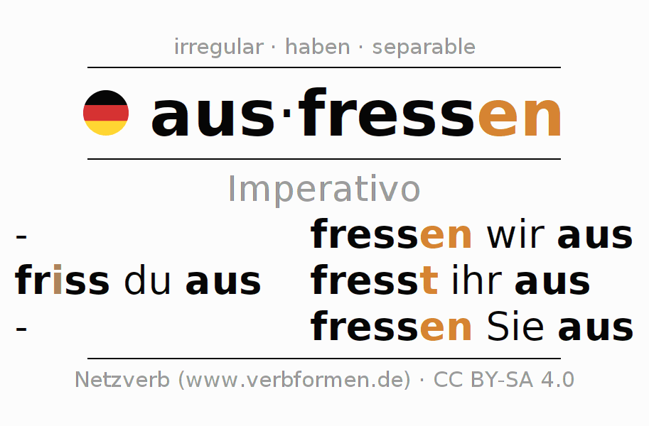 Este verbo ausfressen (comer, devorar) se conjuga en imperativo de la siguiente manera: friss (du) aus, fressen wir aus, fresst (ihr) aus, fressen Sie aus