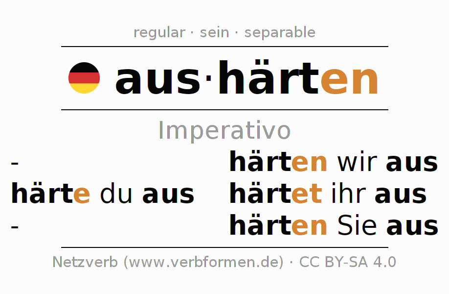 Este verbo aushärten (endurecer, endurecerse) se conjuga en imperativo de la siguiente manera: härte (du) aus, härten wir aus, härtet (ihr) aus, härten Sie aus