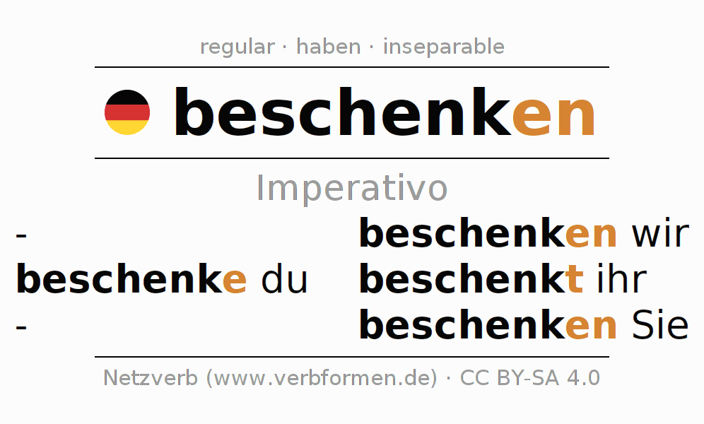 Este verbo beschenken (obsequiar, regalar) se conjuga en imperativo de la siguiente manera: beschenke (du), beschenken wir, beschenkt (ihr), beschenken Sie