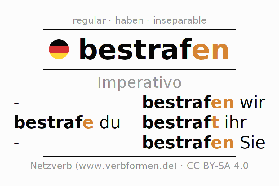 Este verbo bestrafen (castigar, penalizar) se conjuga en imperativo de la siguiente manera: bestrafe (du), bestrafen wir, bestraft (ihr), bestrafen Sie