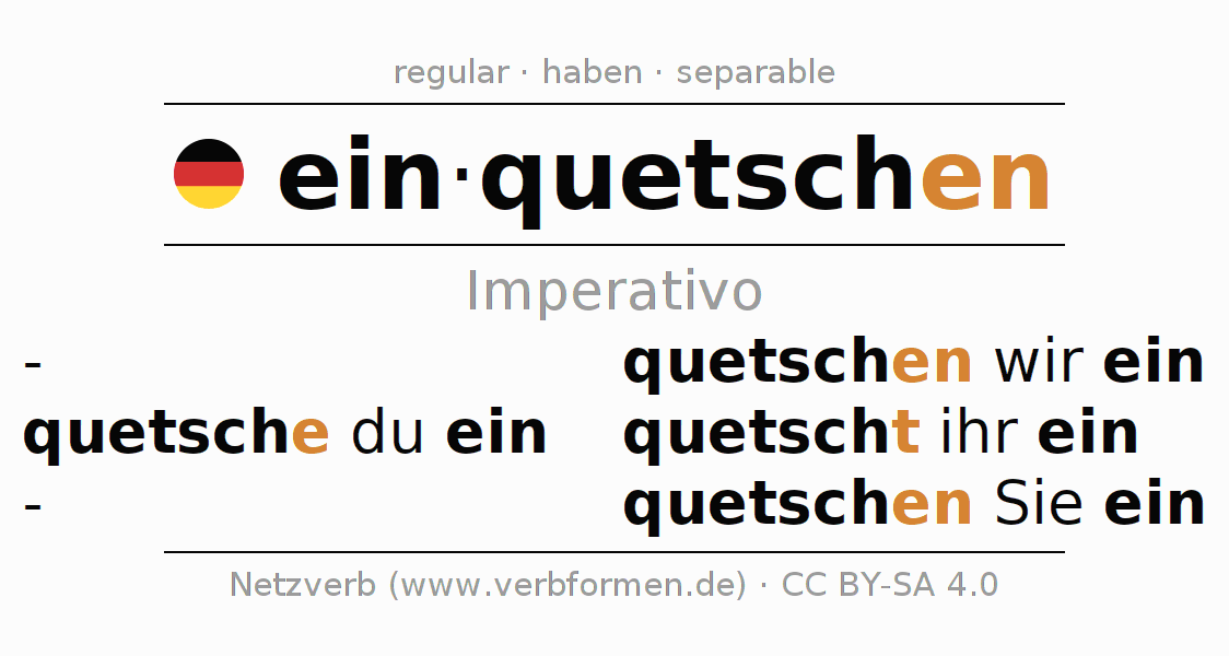 Este verbo einquetschen (estrangular, pillar) se conjuga en imperativo de la siguiente manera: quetsche (du) ein, quetschen wir ein, quetscht (ihr) ein, quetschen Sie ein