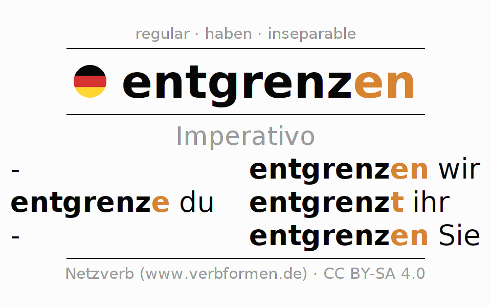 Este verbo entgrenzen (liberarse de límites) se conjuga en imperativo de la siguiente manera: entgrenze (du), entgrenzen wir, entgrenzt (ihr), entgrenzen Sie