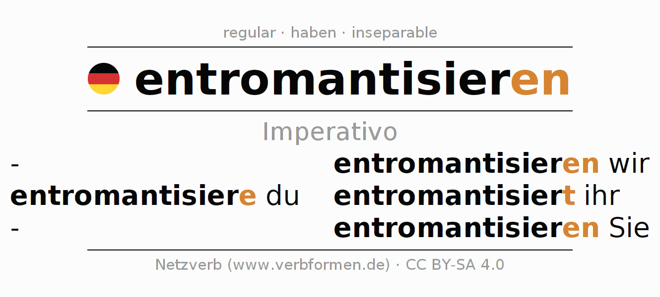 Este verbo entromantisieren (despojar, liberar) se conjuga en imperativo de la siguiente manera: entromantisiere (du), entromantisieren wir, entromantisiert (ihr), entromantisieren Sie