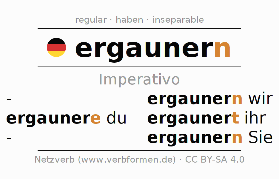 Este verbo ergaunern (estafar, defraudar) se conjuga en imperativo de la siguiente manera: ergaun(e)re (du), ergaunern wir, ergaunert (ihr), ergaunern Sie
