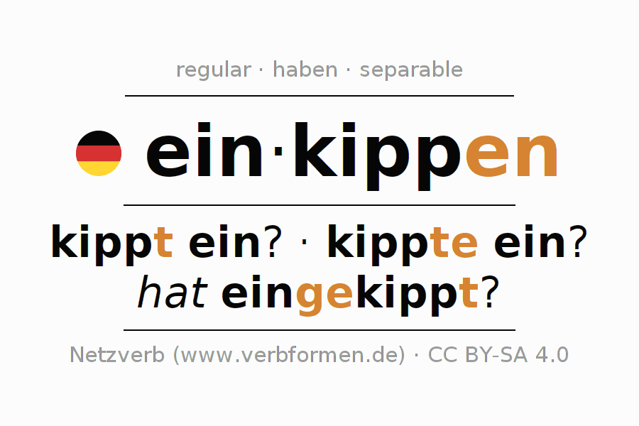 La conjugación de einkippen en Imperativo Presente Imperativo Activo es kippe (du) ein, kippen wir ein, kippt (ihr) ein, kippen Sie ein.Para construir esta formas se requiere seguir algunas reglas gramaticales y también las especificaciones para la conjugación de verbos simples de einkippen en Imperativo . Comentarios ☆