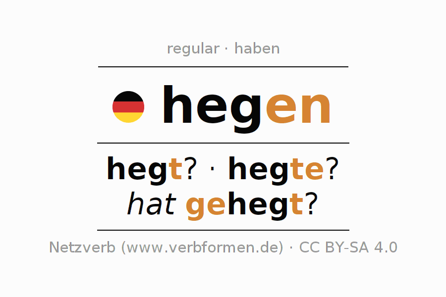 La conjugación de hegen en Imperativo Presente Imperativo Activo es hege (du), hegen wir, hegt (ihr), hegen Sie.Para construir esta formas se requiere seguir algunas reglas gramaticales y también las especificaciones para la conjugación de verbos simples de hegen en Imperativo . Comentarios ☆