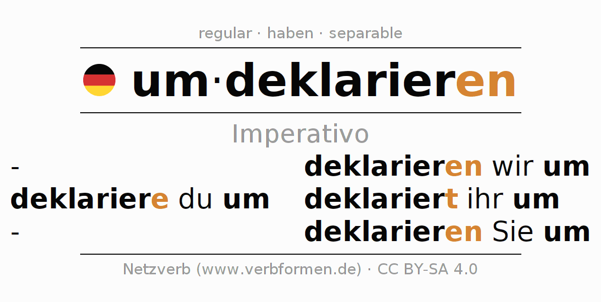 El verbo umdeklarieren, conjugado completamente en todas las personas y números gramaticales en Imperativo Presente.