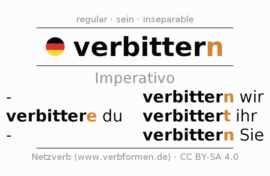 El verbo verbittern (ist), conjugado completamente en todas las personas y números gramaticales en Imperativo Presente.