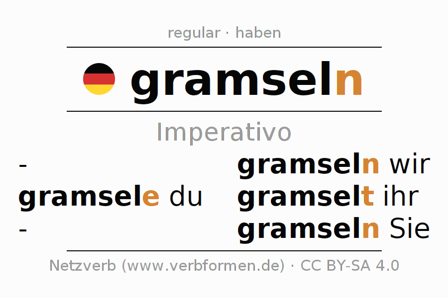 Este verbo gramseln (enroscarse, retorcerse) se conjuga en imperativo de la siguiente manera: grams(e)le (du), gramseln wir, gramselt (ihr), gramseln Sie
