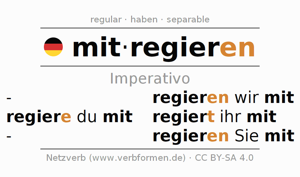 Este verbo mitregieren (co-gobernar, participar en el gobierno) se conjuga en imperativo de la siguiente manera: regiere (du) mit, regieren wir mit, regiert (ihr) mit, regieren Sie mit