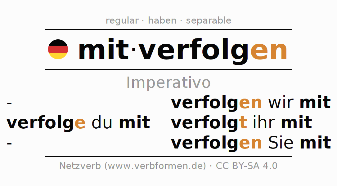 Este verbo mitverfolgen (seguir, acompañar) se conjuga en imperativo de la siguiente manera: verfolge (du) mit, verfolgen wir mit, verfolgt (ihr) mit, verfolgen Sie mit