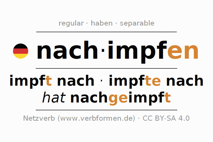 Este verbo nachimpfen (refuerzo, revacunación) se conjuga en imperativo de la siguiente manera: impfe (du) nach, impfen wir nach, impft (ihr) nach, impfen Sie nach
