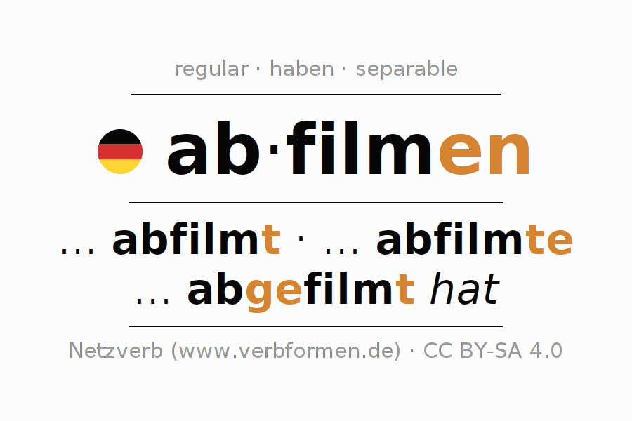 El verbo abfilmen, conjugado completamente en todas las personas y números gramaticales en Imperativo Presente.