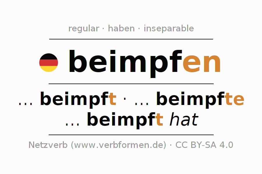La conjugación de beimpfen en Imperativo Presente Imperativo Activo es beimpfe (du), beimpfen wir, beimpft (ihr), beimpfen Sie.Para construir esta formas se requiere seguir algunas reglas gramaticales y también las especificaciones para la conjugación de verbos simples de beimpfen en Imperativo . Comentarios ☆