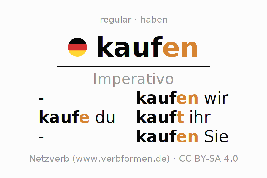 El verbo kaufen, conjugado completamente en todas las personas y números gramaticales en Imperativo Presente.