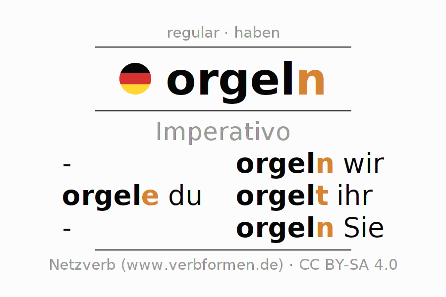 El verbo orgeln, conjugado completamente en todas las personas y números gramaticales en Imperativo Presente.
