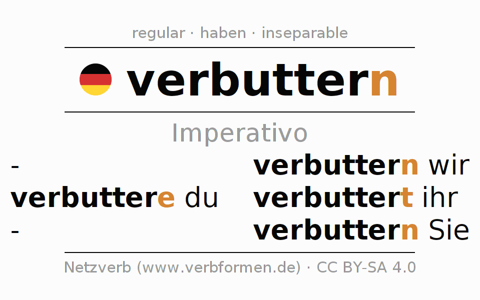 El verbo verbuttern, conjugado completamente en todas las personas y números gramaticales en Imperativo Presente.
