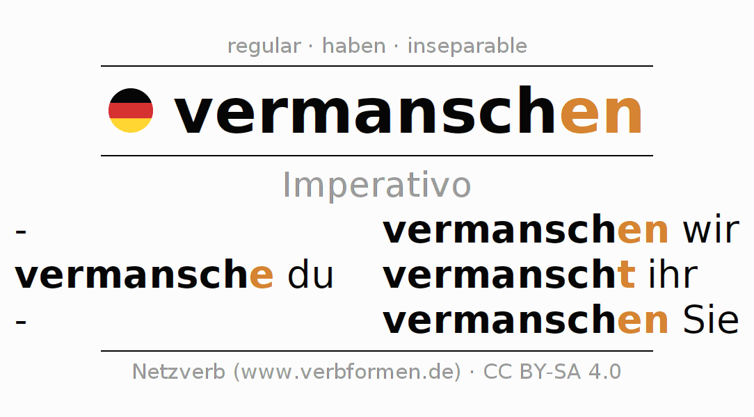El verbo vermanschen, conjugado completamente en todas las personas y números gramaticales en Imperativo Presente.